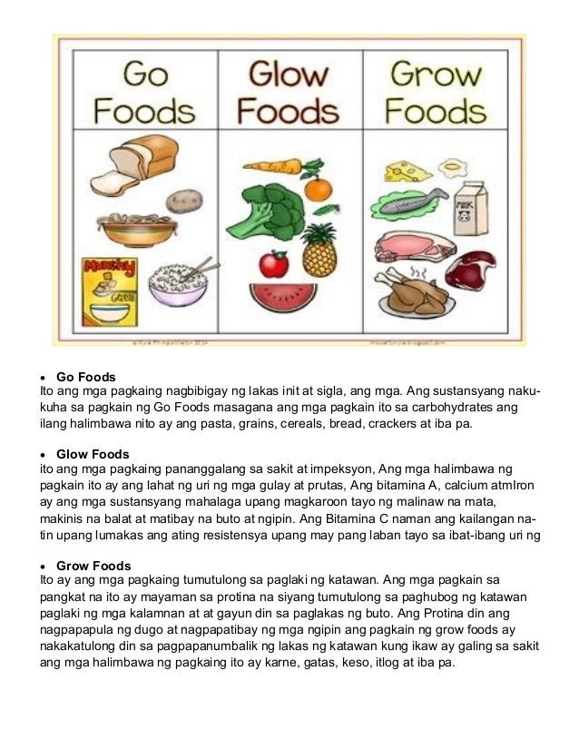 Ang agahan tanghalian at hapunan ay dapat nagtataglay ng pagkain sa bawat pangkat. 3 Basic Food Groups Tagapagbigay LAKAS Go Foods Carbohydrates Ang mga ito ang pangunahing pinagkukunan ng lakas o energy ng ating katawan upang kumilos tumakbo at maglaro. Dapat magkaroon ng sapat na sustansiya mula sa tatlong pangkat ng.